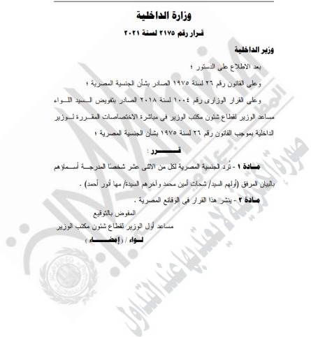 جاء ذلك بعد الاطلاع على الدستور وعلى القانون رقم 26 لسنة 1975 الصادر، وعلى القرار الوزاري رقم 1004 لسنة 2018 الصادر بتفويض اللواء مساعد الوزير لقطاع شئون مكتب الوزير في مباشرة الاختصاصات المقررة لوزير الداخلية، بموجب القانون رقم 26 لسنة 1975 بشأن الجنسية المصرية.