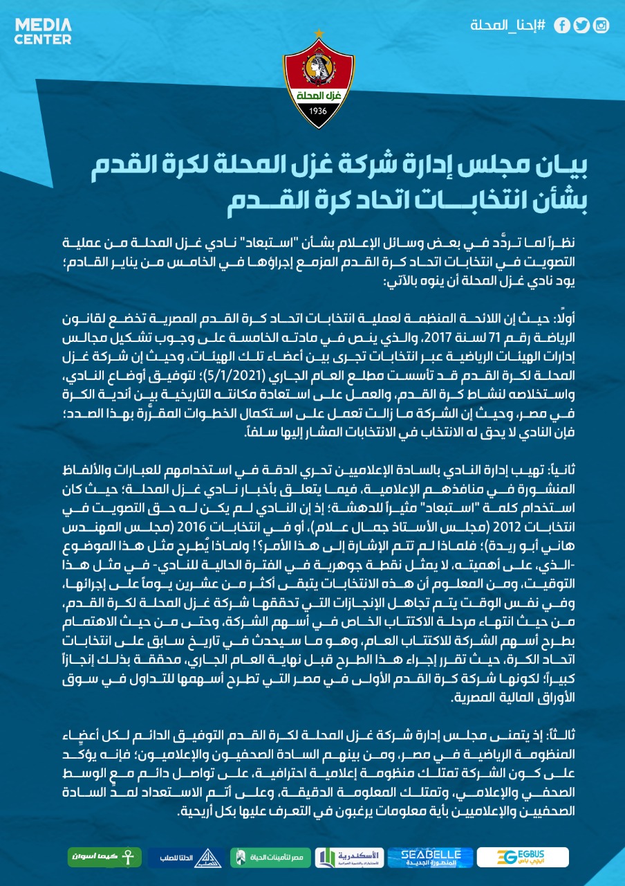 "نظرًا لما تردَّد في بعض وسائل الإعلام بشأن استبعاد نادي غزل المحلة من عملية التصويت في انتخابات اتحاد كرة القدم المزمع إجراؤها في الخامس من يناير القادم؛ يود نادي غزل المحلة أن ينوه بالآتي: