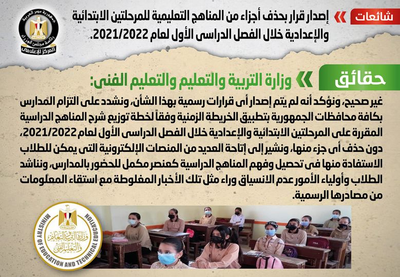 وأكدت وزارة التربية والتعليم والتعليم الفني، أنه لا صحة لإصدار أي قرارات بحذف أجزاء من المناهج التعليمية للمرحلتين الابتدائية والإعدادية خلال الفصل الدراسي الأول لعام 2021/2022، وأنه لم يتم إصدار أي قرارات رسمية بهذا الشأن.