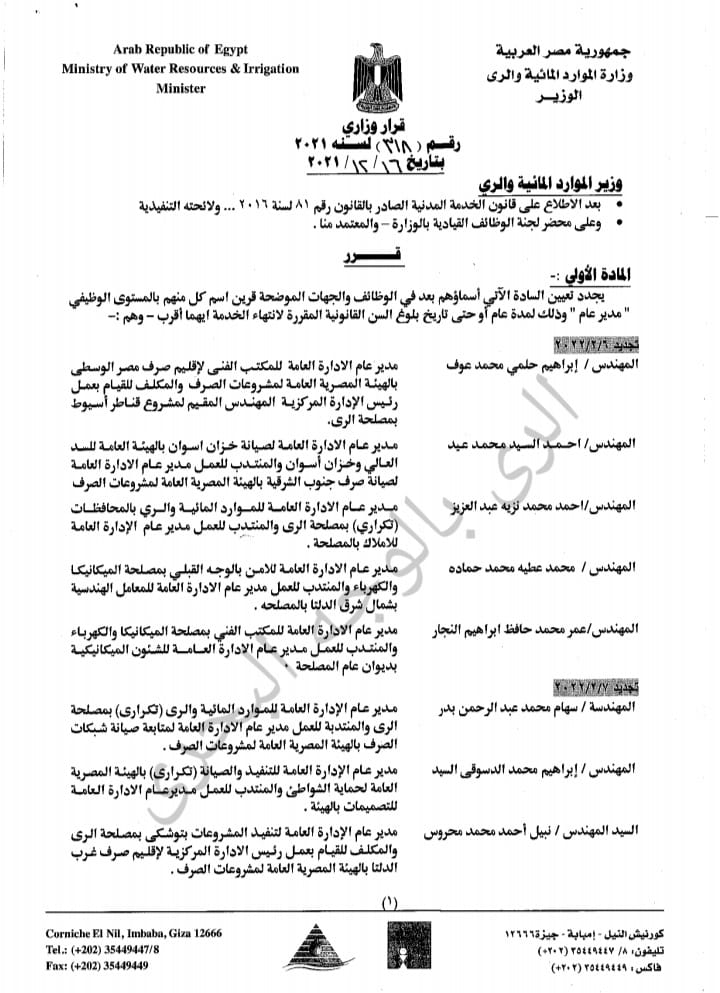 أعلنت وزارة الموارد المائية والري، بموجب القرار الوزاري رقم 318 الصادر بتاريخ 16-12-لسنة 2021 تجديد تعيين عدد من الأسماء في مستوى وظيفي مدير عام، لمدة عام أو حتى تاريخ بلوغ السن القانوني لانتهاء الخدمة أيهما أقرب وجاءت الأسماء على النحو التالي:-