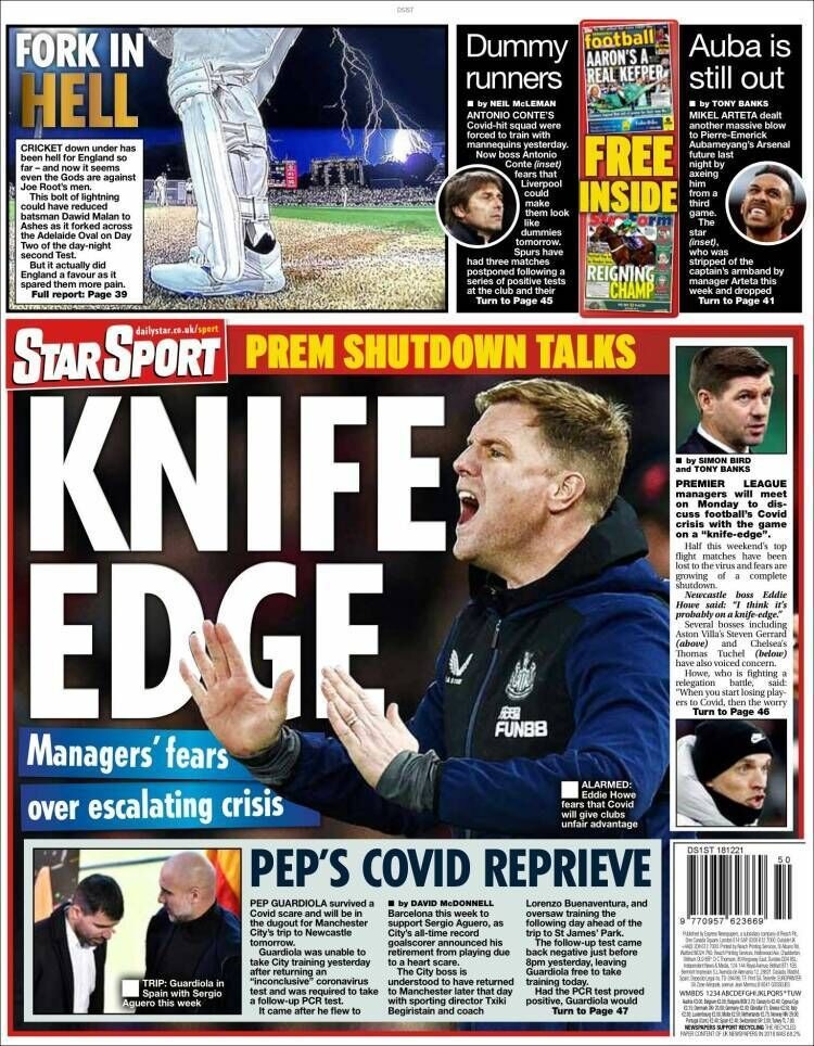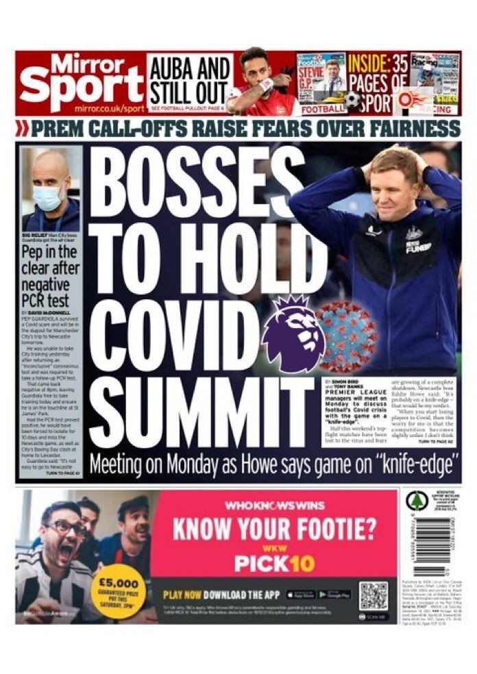 سلطت الصحيفة الضوء على ما تحدث عنه إيدي هاو مدرب فريق نيوكاسل، بأن يوم الاثنين سيشهد اجتماعًا بين مدربي البريميرليج لتحديد ما يمكن فعله لمواجهة تفشي الفيروس، وذلك تحت عنوان مخاوف المدربين.