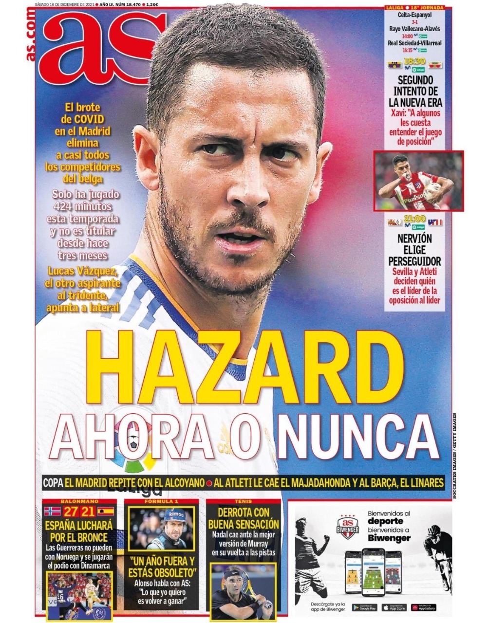 عنونت آس غلافها بـ هازارد الأن أو أبدًا، حيث أدى تفشي فيروس كورونا في مدريد إلى القضاء على جميع مُنافسين هازارد تقريبًا.
