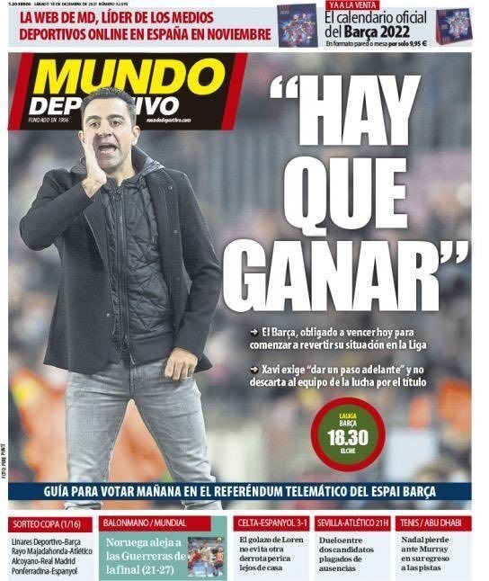 تصدر تشافي هيرنانديز غلاف موندو ديبورتيفو، حيث قالت الصحيفة علينا أن نفوز، في إشارة إلى أهمية تحقيق الفوز في مباراة إلتشي عقب التعثرات المستمرة مؤخرًا.