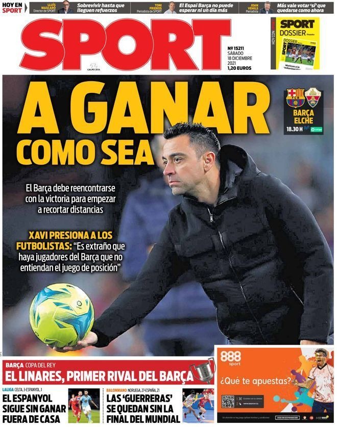 تصدر تشافي هيرنانديز مدرب فريق برشلونة غلاف سبورت لعدد اليوم، وذلك تحت عنوان هيا نفوز بها، في رسالة تحفيزية قبل مواجهة إلتشي.
