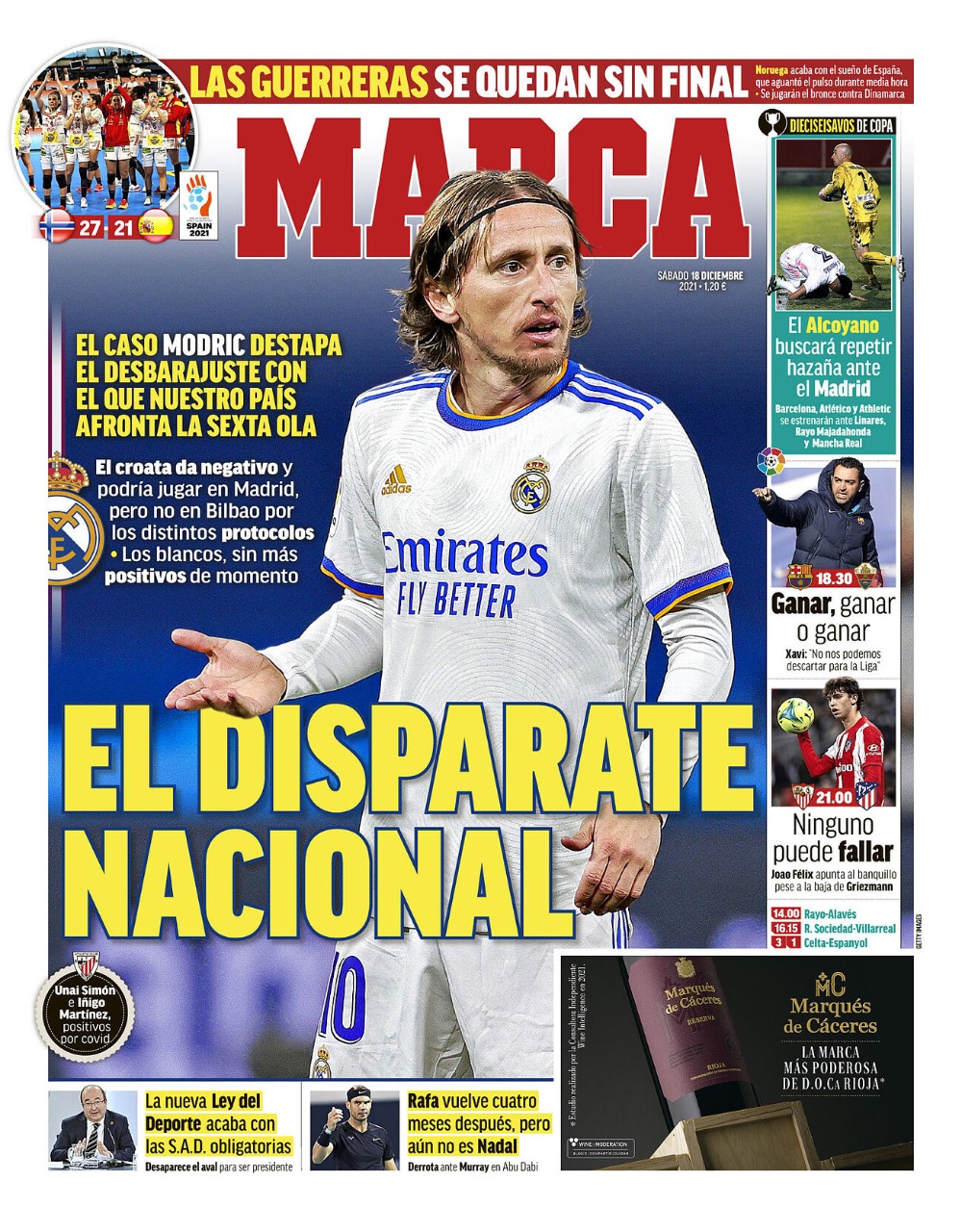 تصدر العنوان العبث الوطني غلاف صحيفة ماركا لعدد اليوم، حيث أكدت الصحيفة أن إصابة مودريتش بفيروس كورونا تكشف الفوضى التي تواجه بها البلاد الموجة السادسة؛ نظرًا لأن لوكا بإمكانه اللعب في مدريد، ولكن ليس في بلباو بسبب البروتوكولات المختلفة.