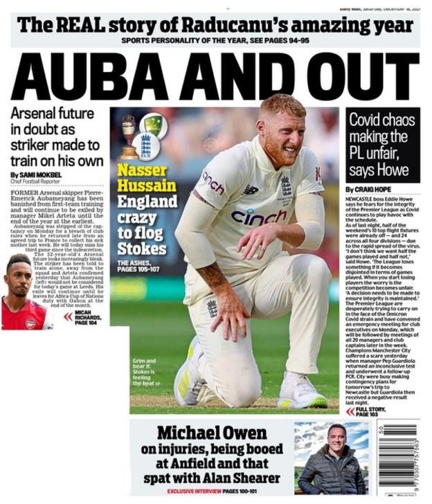 عنونت ديلي ميل غلافها اليوم أوباماينج بالخارج، في إشارة إلى أن الجابوني أصبح على أعتاب الرحيل عن أرسنال، عقب طرده من تدريبات الجانرز أمس.