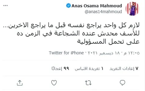 وكتب أنس عبر صفحته علي تويتر قائلا: لازم كل واحد يراجع نفسه قبل ما يراجع الآخرين.. للأسف محدش عنده الشجاعة في الزمن ده على تحمل المسؤولية.