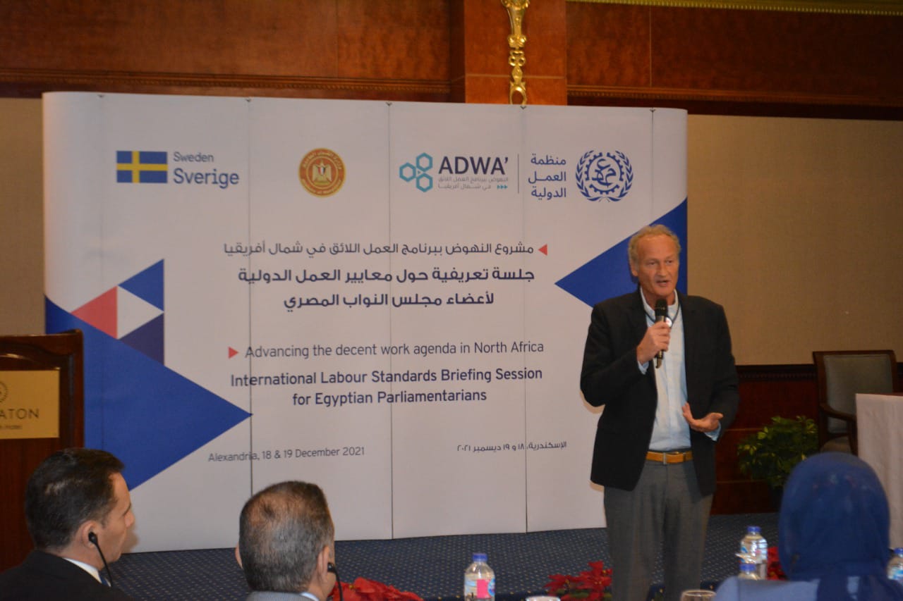 شاركت وزارة القوى العاملة في أعمال الجلسة التعريفية التي ينظمها مكتب منظمة العمل الدولية بالقاهرة والتي عقدت بمحافظة الإسكندرية، حول معايير العمل الدولية لأعضاء مجلس النواب بحضور لجان القوى العاملة، والصناعة، والتضامن الاجتماعي، والعلاقات الخارجية بالمجلس، ضمن مشروع النهوض بالعمل اللائق في شمال إفريقيا، وتستمر الجلسة يومين.