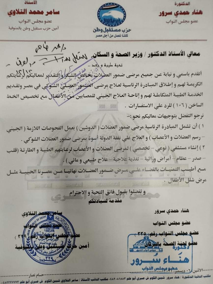 تقدم نائبان بمجلس النواب في المنوفية بطلب لوزارة الصحة لإنشاء مستشفى خاص بمرضى ضمور العضلات والأعصاب، وهما النائب سامر التلاوي عضو مجلس النواب أمين عام حزب مستقبل وطن بالمنوفية، والدكتورة هناء سرور عضو لجنة الصحة بمجلس النواب، واقترح النائبين على وزارة الصحة بإنشاء مستشفى نوعي تخصصي لمرضي العضلات والأعصاب لرعايتهم الطبية.