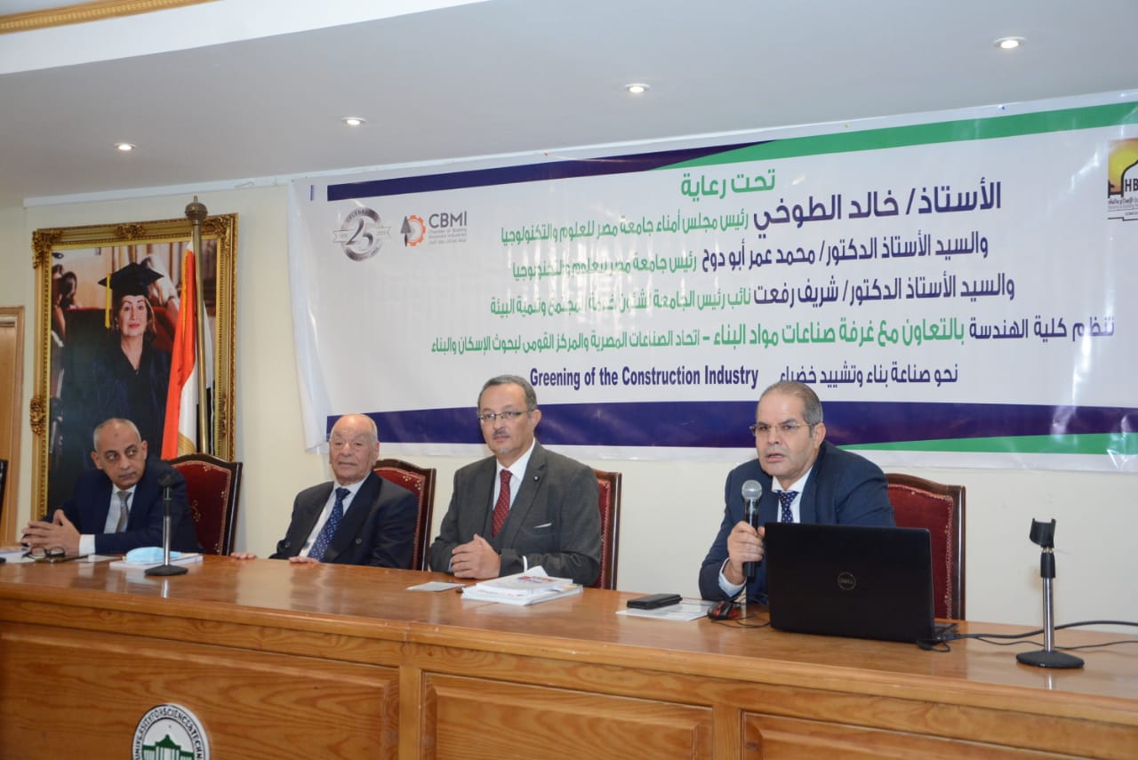 وحضر الافتتاح؛ أحمد عبد الحميد، رئيس غرفة صناعات مواد البناء، المهندس أشرف عفيفي، الرئيس السابق للهيئة المصرية للمواصفات والجودة، الدكتور محمد كفافي، رئيس المجلس العالمي للاقتصاد الأخضر، والمهندس حاتم المنوفي، المدير التنفيذي لغرفة صناعات مواد البناء ولفيف من طلبة كلية الهندسة من مختلف تخصصات العمارة والتخطيط.