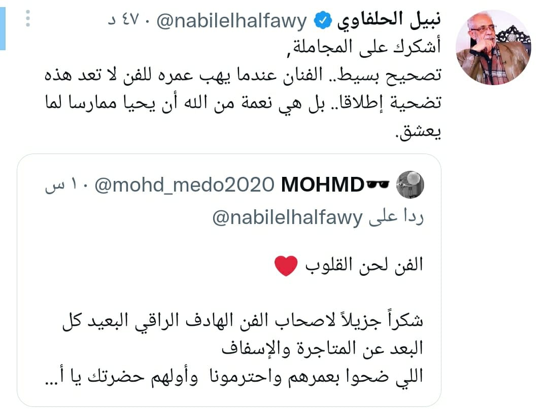 وكتب نبيل الحلفاوي تغريدة، عبر حسابه الشخصي بموقع التدوينات القصيرة تويتر، مغردًا: أشكرك على المجاملة، تصحيح بسيط الفنان عندما يهب عمره للفن، لا تعد هذه تضحية إطلاقًا، بل هي نعمة من الله أن يحيا ممارسًا لما يعشق.