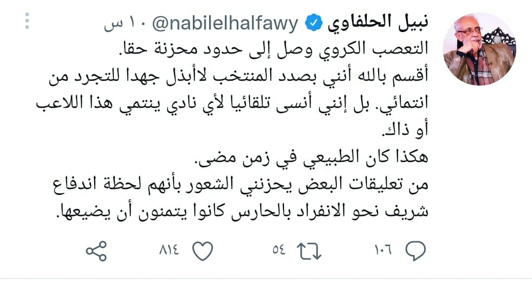 كما كتب الحلفاوي تغريدة أخرى، يدعو فيها لعدم التعصب الكروي، مشيرًا أن هذا الأمر أصبح صعبًا للغاية، ووصل لحدود محزنة، حيث قال: التعصب الكروي وصل إلى حدود محزنة حقًا، أقسم بالله أنني بصدد المنتخب، لا أبذل جهدًا للتجرد من انتمائي، بل إنني أنسى تلقائيًا لأي نادي ينتمي هذا اللاعب أو ذاك.