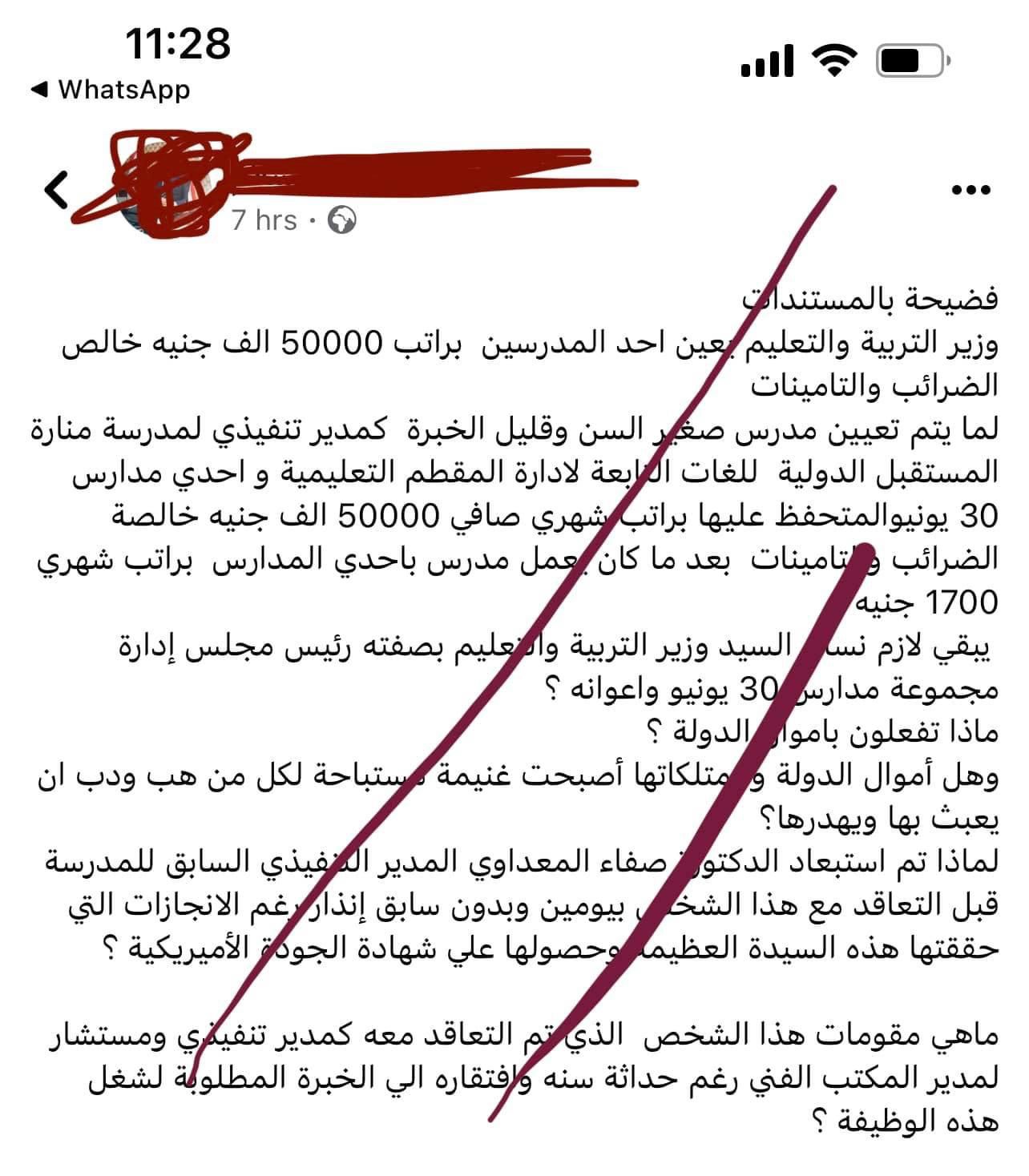 وأشار إلى أن مدير المدرسة يمتلك تاريخا عمليا في العديد من المدارس الدولية في مصر وخارجها بمرتبات أعلى من ذلك بكثير ويتم تمويل المرتبات في مدارس 30 يونيو من إيرادات هذه المدارس الدولية وليس من موازنة الوزارة على الإطلاق، وهذا تحت إشراف لجنة التحفظ بوزارة العدل المصرية المسؤولة عن هذه المجموعة من المدارس.
