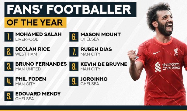 واستطاع صلاح أن يتغلب على نجوم الدوري الإنجليزي في الاستفتاء وحصد غالبية الأصوات، حيث تخطى الوصيف، ديكلان رايس لاعب وست هام يونايتد، وبرونو فيرنانديز نجم مانشستر يونايتد، حيث جاء الأخير في المركز الثالث.