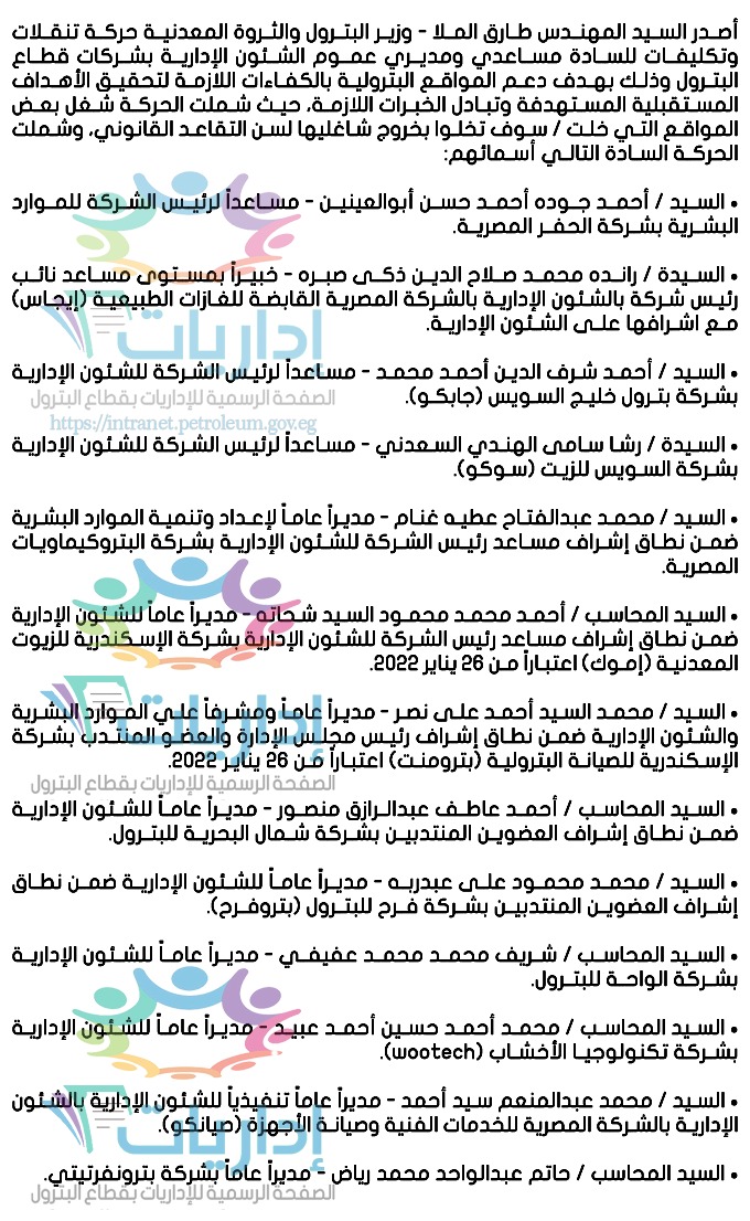 أصدر المهندس طارق الملا، وزير البترول والثروة المعدنية، حركة تنقلات لمساعدي ومديري عموم الشئون الإدارية، بشركات قطاع البترول؛ لدعم المواقع بالكفاءات اللازمة، كما شملت الحركة، بعض المواقع التي خَلَت؛ لوصول شاغليها إلى سن التقاعد.