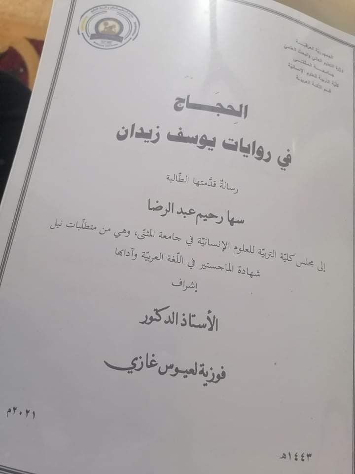 ناقشت كلية التربية بجامعة المثنى العراقية، خلال الأيام الماضية، رسالة ماجستير مقدمة من الباحثة سها رحيم، وكان عنوان البحث الذي قدمته الباحثة لنيل الدرجة الحجاج في روايات يوسف زيدان، حيث حصلت به على درجة الماجستير في اللغة العربية، بتقدير امتياز.