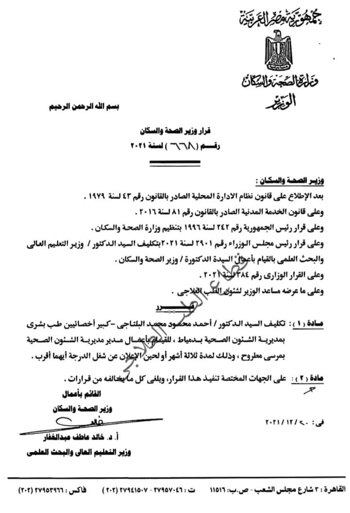أصدر الدكتور خالد عبدالغفار، القائم بأعمال وزيرة الصحة، قرارًا بتعيين الدكتور أحمد البلتاجي، وكيلا لوزارة الصحة بمطروح خلفا للدكتور محمد علي، وذلك لمدة 3 أشهر بدءًا من اليوم.