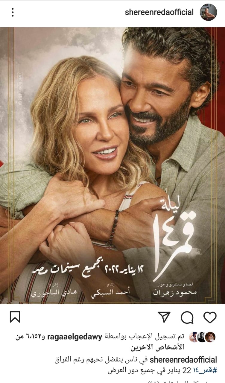 ونشرت شيرين رضا صورة البويتر الرسمي لفيلم قمر 14، عبر حسابها الشخصي بموقع تبادل الصور والفيديوهات القصيرة انستجرام، وعلقت عليها قائلة: في ناس بنفضل نحبهم رغم الفراق.. فيلم قمر 14 يوم 22 يناير المقبل في جميع دور العرض.
