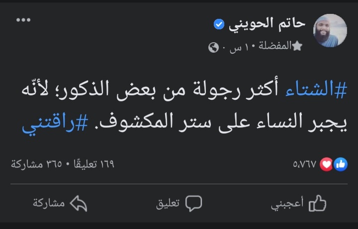 ورفع حاتم الحويني منشورًا له، عبر صفحته الرسمية بموقع التواصل الاجتماعي فيسبوك، كتب فيه: الشتاء أكثر رجولة من بعض الذكور؛ لأنّه يجبر النساء على ستر المكشوف، مختتما منشوره بهاشتاج: راقتني، في إشارة إلى إعجابه بما نشره في هذا الشأن.