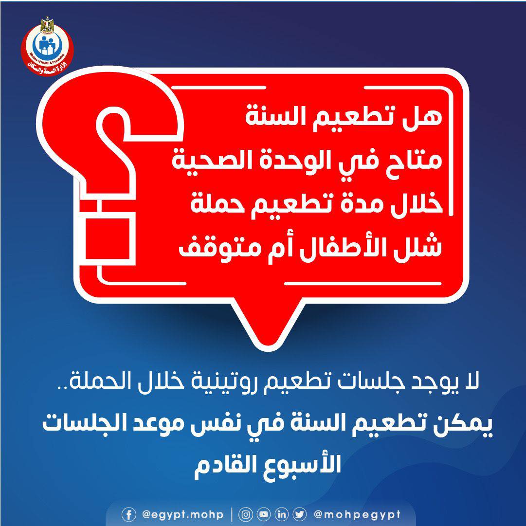 وأوضحت وزارة الصحة والسكان على صفحتها الرسمية بمواقع التواصل الاجتماعي، أن جلسات تطعيم السنة والتطعيمات الروتينية تتوقف خلال عمل الحملة القومية للتطعيم ضد شلل الأطفال.