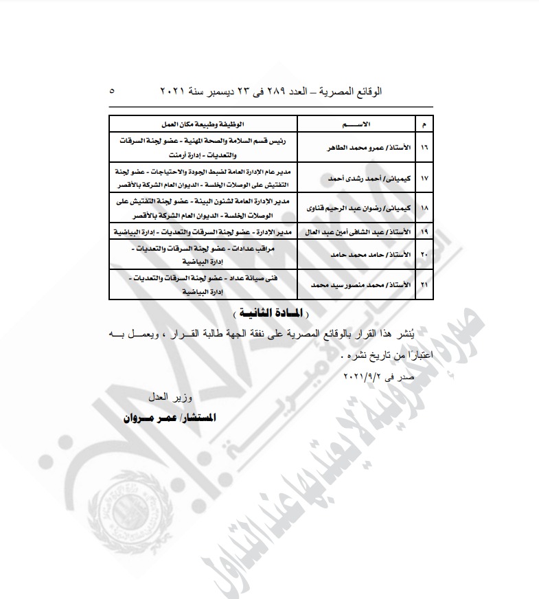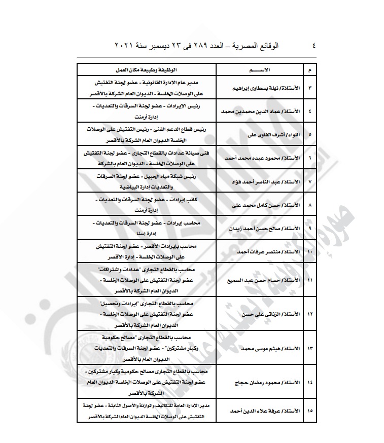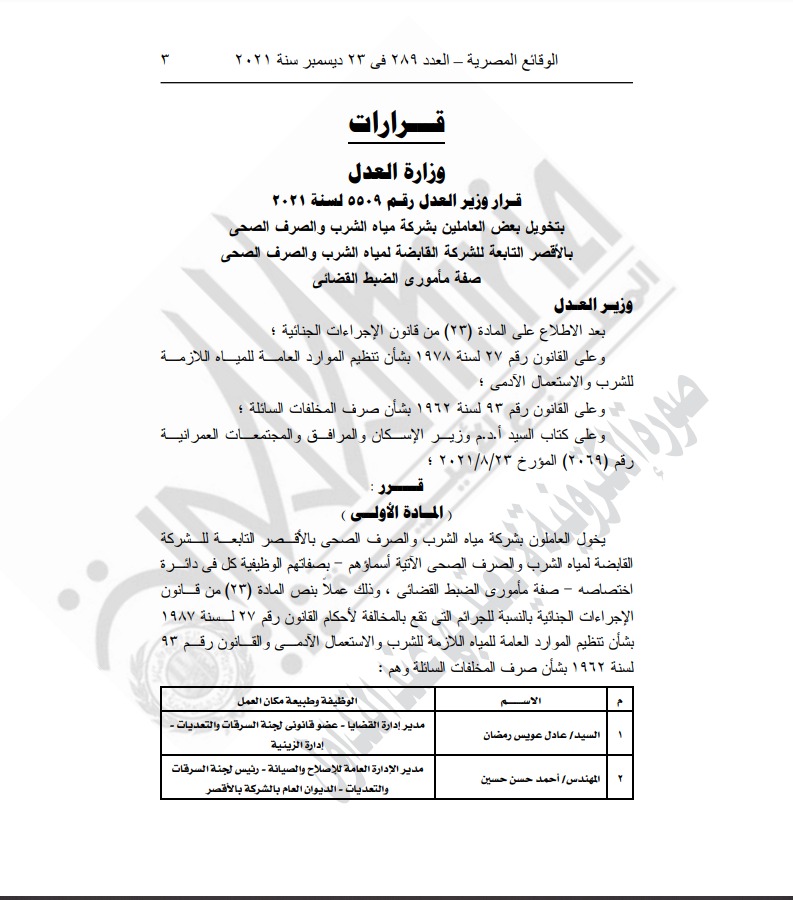 وتضمن قرار وزير العدل، بتحويل العاملون بشركة مياه الشرب والصرف الصحي بالأقصر التابعة للشركة القابضة لمياه الشرب والصرف الصحي الآتية أسماؤهم، بصفاتهم الوظيفية كل في دائرة اختصاصه صفة مأموري الضبط القضائي.