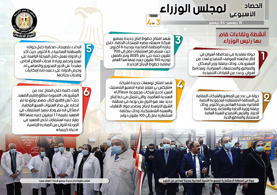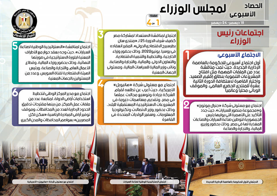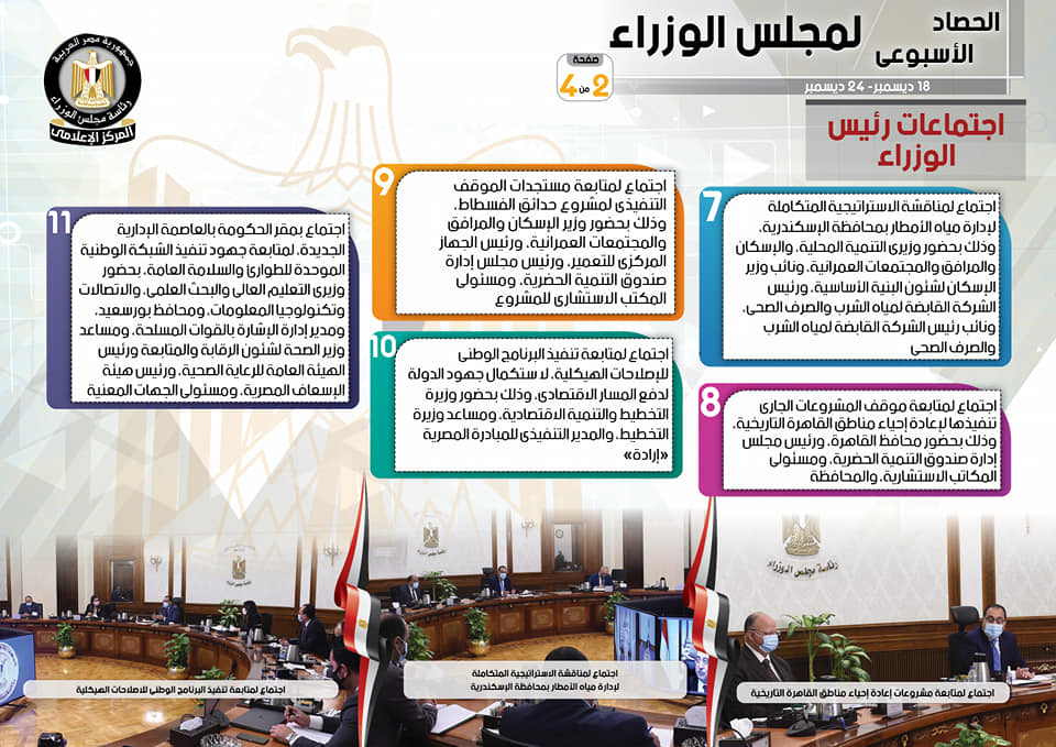 نشر المركز الإعلامي لمجلس الوزراء، تقريرًا شمل إنفوجرافات سلط من خلالها الضوء على الحصاد الأسبوعي لمجلس الوزراء، وذلك خلال الفترة من 18 حتى 24 ديسمبر 2021، والذي تضمن الاجتماعات واللقاءات التي عقدها الدكتور مصطفى مدبولي، رئيس مجلس الوزراء، بالإضافة إلى ما أجراه من أنشطة.