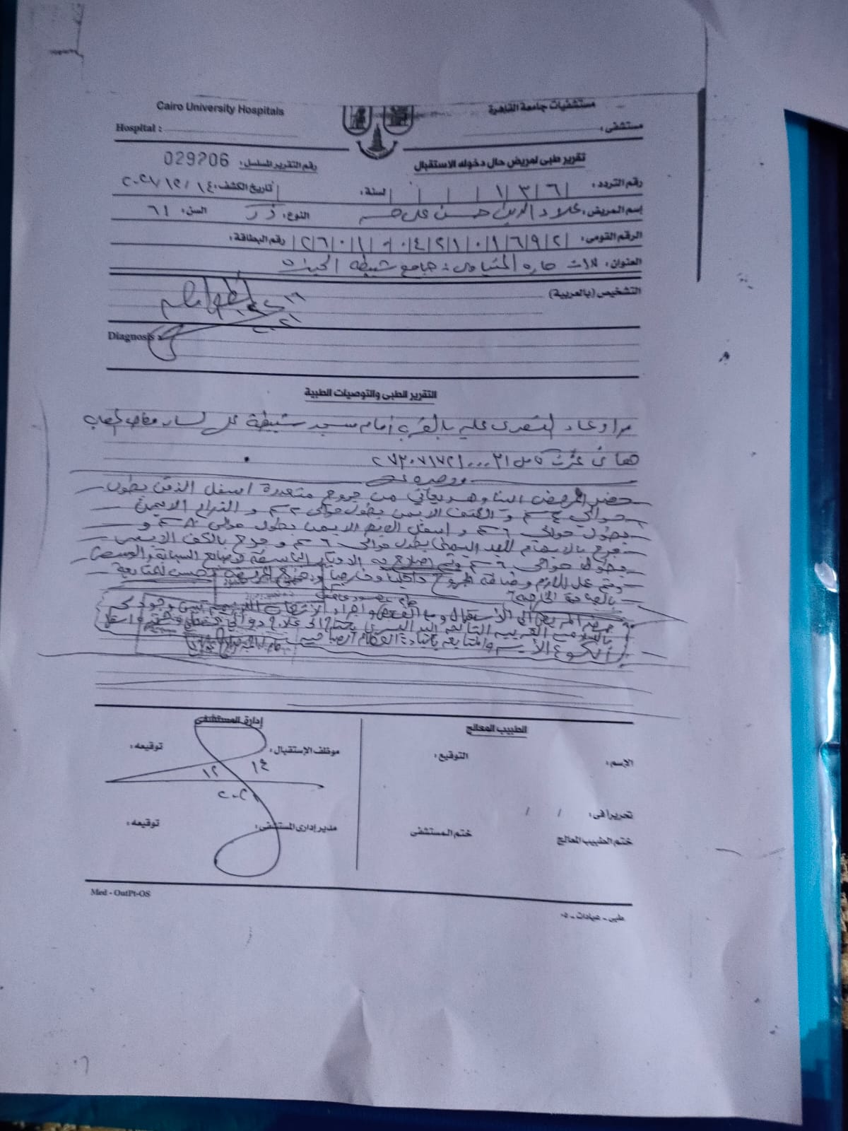 وحصل القاهرة 24، على التقرير الطبي الخاص بحالة المجنى عليه علاء الدين حسن، البالغ من العمر 61 عامًا، وقال التقرير الطبي، إن الضحية يعاني من جروح متعددة أسفل الذقن بطول حوالي 4 سم والكتف الأيمن بطول حوالي 2 سم والذراع الأيمن بطول حوالي 6 سم وأسفل الإبط الأيمن وجروح بالإبهام اليد اليمنى.