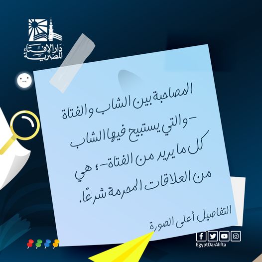 حسمت دار الإفتاء الجدل الدائر حول حكم المصاحبة بين الشاب والفتاة، قائلة: المصاحبة بين الشاب والفتاة، والتي يستبيح فيها الشاب كل ما يريد من الفتاة؛ هي من العلاقات المحرمة شرعًا.