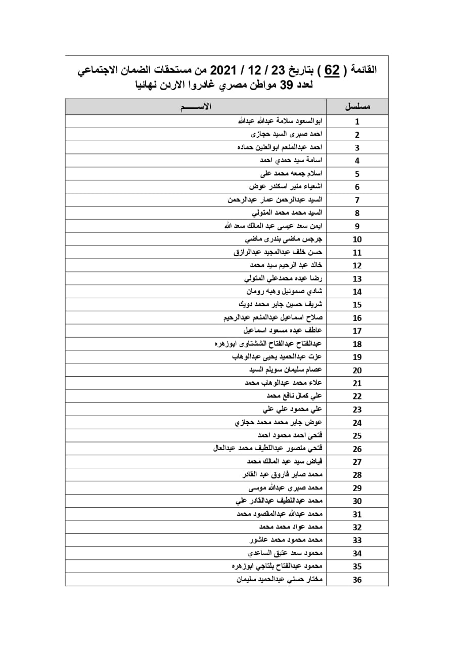 أعلن وزير القوى العاملة محمد سعفان، أن مكتب التمثيل العمالي التابع للوزارة بالسفارة المصرية بعمان-الأردن، استطاع بالمتابعة اللحظية والجهود المبذولة والمقابلات مع المسئولين بمؤسسة الضمان الاجتماعي بالأردن، واستكمالا لما تم تحويله سابقا، تم تحويل القائمة الـ 62 من مستحقات الضمان الاجتماعي لنحو 39 عامل مصري لدى المؤسسة غادروا عمان نهائيا.