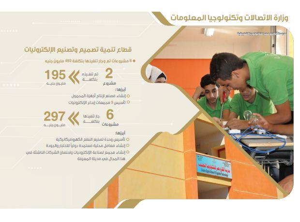 وذكر كتاب الرؤية والانجاز أنه تم وجار تنفيذ 8 مشروعات في قطاع تنمية تصميم وتصنيع الإلكترونيات، بتكلفة 492 مليون جنيه، منها مشروعان تم تنفيذهما بتكلفة 195 مليون جنيه، وإنشاء مصنع لإنتاج أجهزة المحمول، تأسيس 3 مجمعات إيداع الإلكترونيات، وجار تنفيذ 6 مشروعات بتكلفة 297 مليون جنيه، أبرزها: تأسيس وحدة تصنيع النظم الكهروميكانيكية، إنشاء معامل محلية معتمدة دوليًا للاختبار والجودة، إنشاء مجمع لصناعة الإلكترونيات واحتضان الشركات الناشئة في هذا المجال في مدينة المعرفة.
