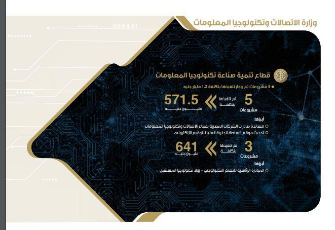ولفت كتاب الرؤية والإنجاز أنه تم وجار تنفيذ 8 مشروعات في قطاع تنمية صناعة تكنولوجيا المعلومات، بتكلفة 1.2 مليار جنيه، منها 5 مشروعات تم تنفيذها بتكلفة 571.5 مليون جنيه، أبرزها: مساندة صادرات الشركات المصرية بقطاع الاتصالات وتكنولوجيا المعلومات، تحديث موقع السلطات الجذرية العليا للتوقيع الإلكتروني. وجار تنفيذ 3 مشروعات بتكلفة 641 مليون جنيه، أبرزها: المبادرة الرئاسية للتعليم التكنولوجي – رواد تكنولوجيا المستقبل.