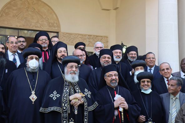 البابا تواضروس وبطريرك الأقباط الكاثوليك يلتقطون صورًا تذكارية بالمقر البطريركي في كوبري القبة