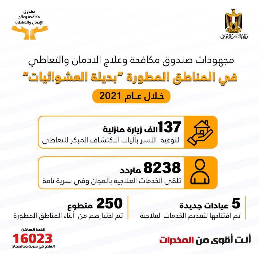 استعرضت نيفين القباج، وزيرة التضامن الاجتماعي ورئيس مجلس إدارة صندوق مكافحة وعلاج الإدمان والتعاطي تقريرًا عن مجهودات الصندوق على مدار عام 2021 بالمناطق المطورة، بديلة العشوائيات: حي الأسمرات والمحروسة وحدائق أكتوبر، وروضة السيدة بمحافظة القاهرة وبشاير الخير بمحافظة الإسكندرية وحي الضواحي بمحافظة بورسعيد، وكذلك المناطق التي سيتم تطويرها، مثل صبحي حسين، واسطبل عنتر، وعزبة خير الله بالقاهرة، وكذلك مناطق كرموز وغيط العنب بمحافظة الإسكندرية حيث تم تنفيذ العديد من البرامج التوعوية المتكاملة للوقاية الإدمان، تنفيذا لتكليفات رئيس الجمهورية لوزارة التضامن بتنفيذ برامج الحماية من المخدرات بالمناطق السكنية الجديدة بديلة العشوائيات.