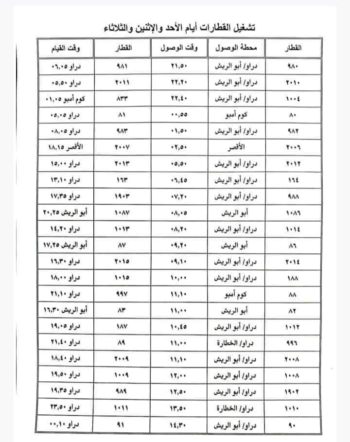 جدول مواعيد والمحطات الانتهائية لقطارات السكة الحديد بعد غلق محطة أسوان
