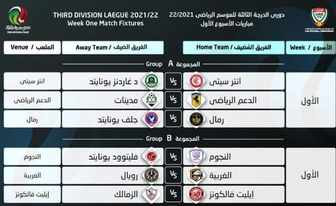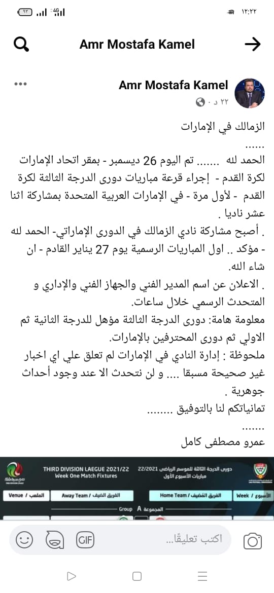 وكتب عمرو مصطفي عبر حسابه على موقع التواصل الاجتماعي فيس بوك: الزمالك في الإمارات.. الحمد لله، تم اليوم 26 ديسمبر - بمقر اتحاد الإمارات لكرة القدم - إجراء قرعة مباريات دوري الدرجة الثالثة لكرة القدم - لأول مرة - في الإمارات العربية المتحدة بمشاركة 12 ناديا.