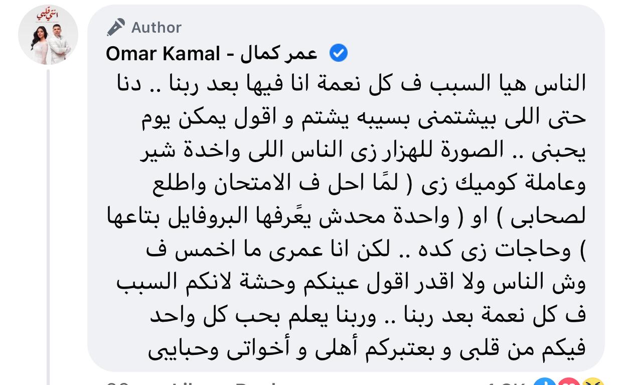 واختتم عمر: لكن أنا عمرى ما أخمس ف وش الناس ولا أقدر أقول عينكم وحشة لأنكم السبب في كل نعمة بعد ربنا.. وربنا يعلم بحب كل واحد فيكم من قلبي وبعتبركم أهلي وأخواتي وحبايبي.