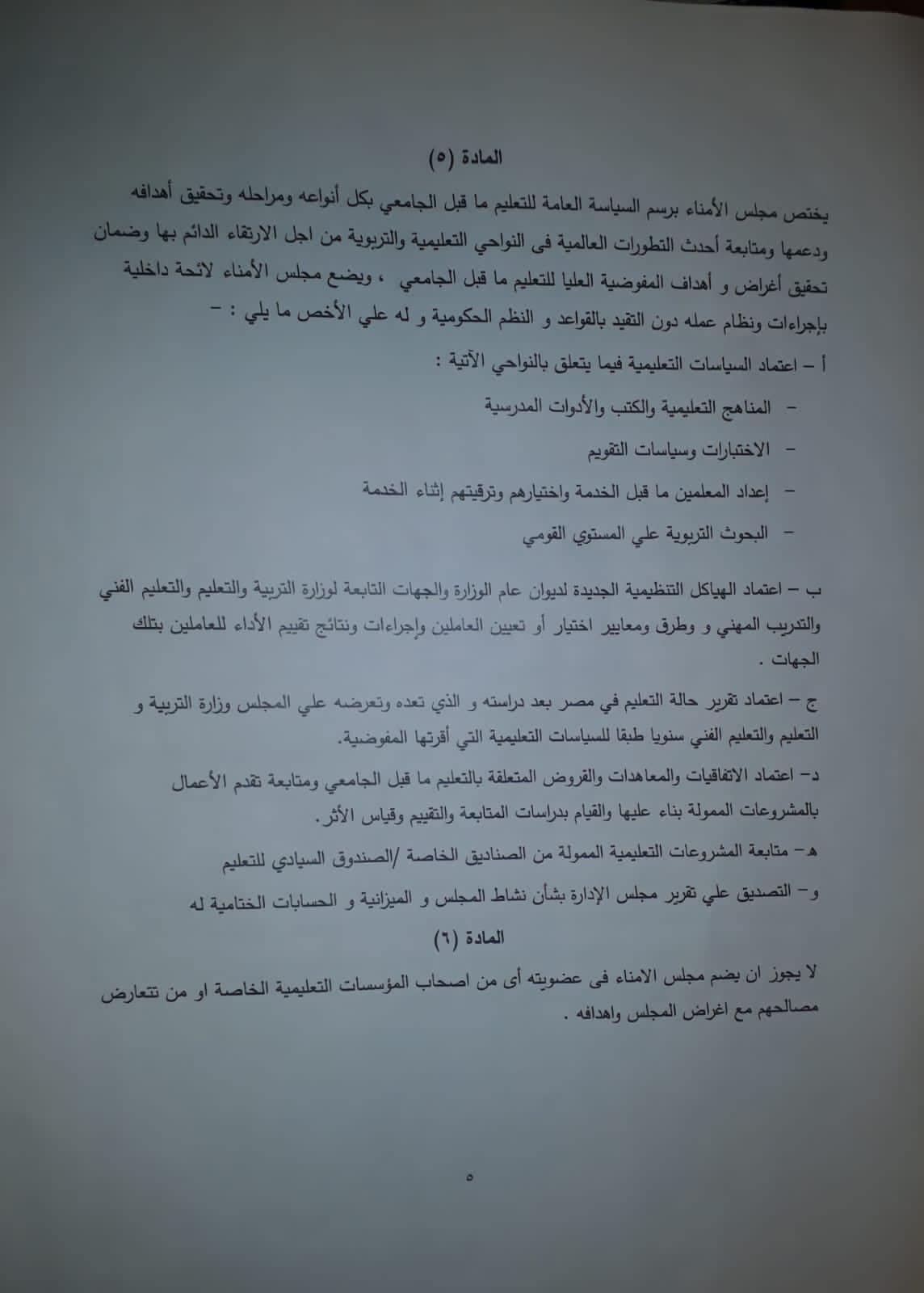4- وضع السياسة التي تهدف إلى الارتقاء بالأداء المهني لهيئات التدريس وتوفير القوى البشرية عالية الكفاءة اللازمة لمختلف أنواع ومراحل التعليم ما قبل الجامعي.