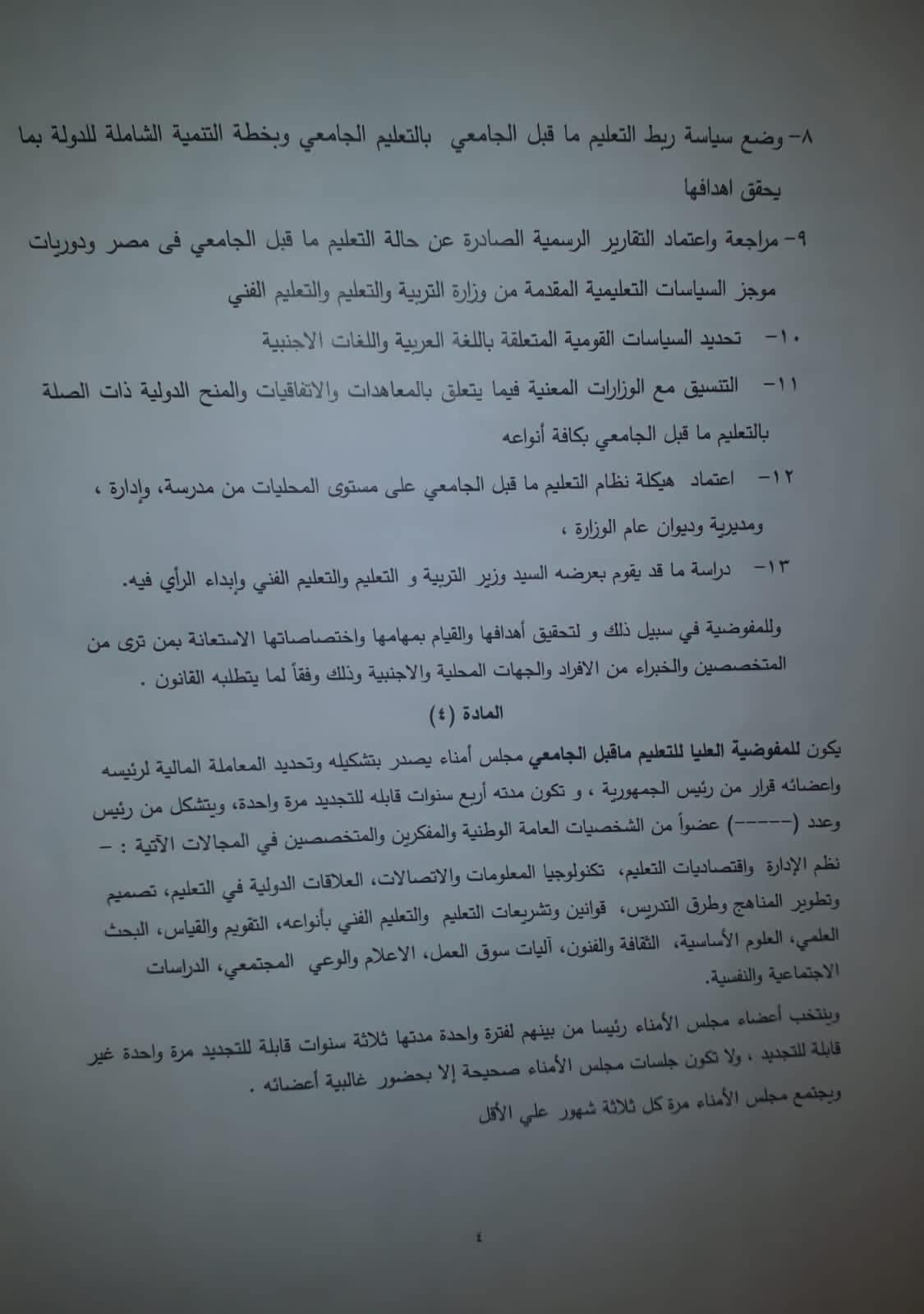 ونصت المادة الثانية، على أن المفوضية تهدف إلى النهوض والارتقاء بالتعليم ما قبل الجامعي بكافة أنواعه، من خلال وضع الخطط والسياسات اللازمة، لتحقيق ذلك، ومتابعة تنفيذها ولها على الأخص ما يلي: