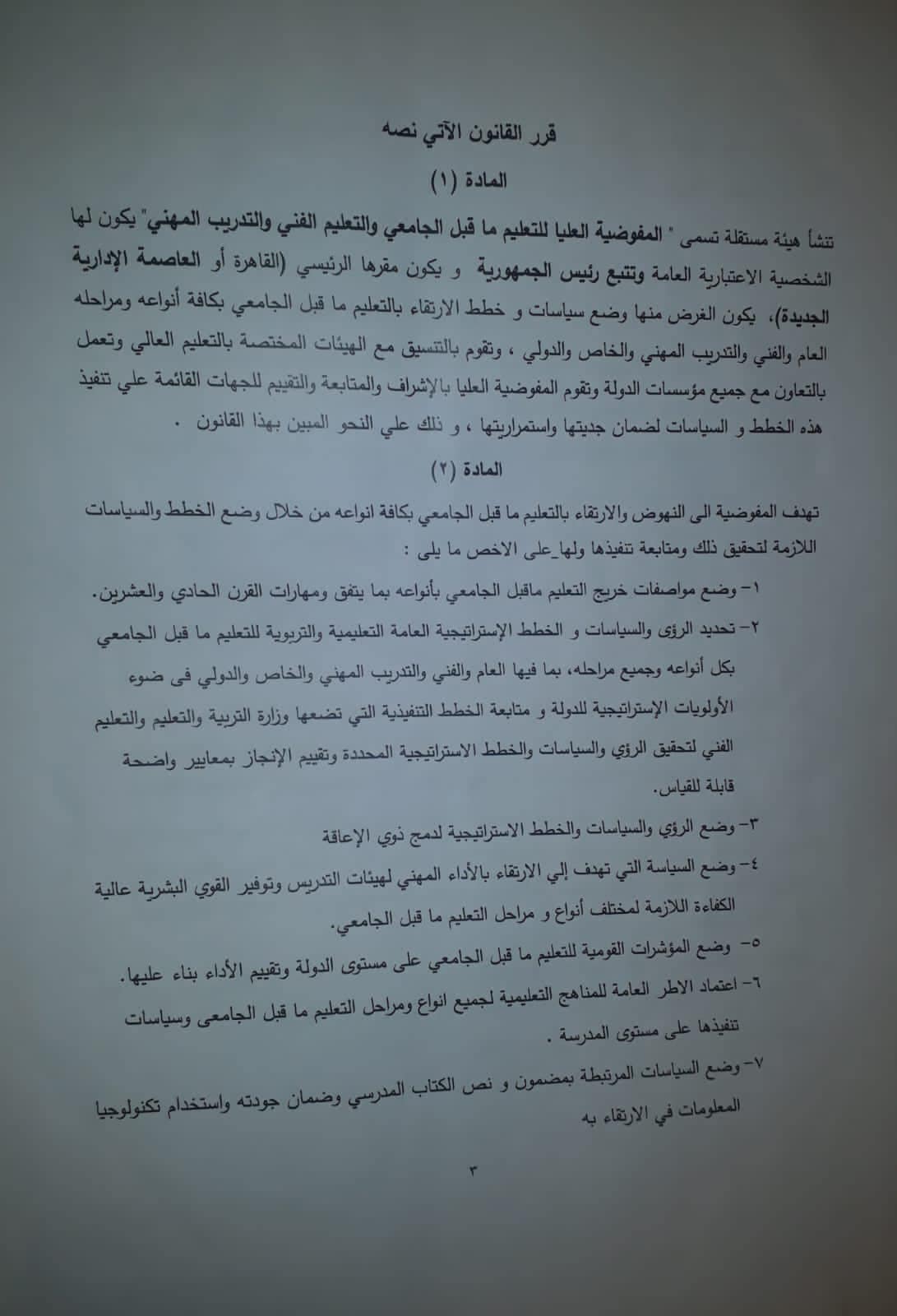 وأكد قانون إنشاء المفوضية العليا للتعليم ما قبل الجامعي والتعليم الفني والتدريب المهني، الذي حصل القاهرة 24 على نسخة منه، أن يكون الغرض منه وضع سياسات وخطط الارتقاء بالتعليم ما قبل الجامعي بكافة أنواعه ومراحله العام والفني والتدريب المهني والخاص والدولي، وتقوم بالتنسيق مع الهيئات المختصة بالتعليم العالي، وتعمل بالتعاون مع جميع مؤسسات الدولة، وتقوم المفوضية العليا بالإشراف والمتابعة والتقييم للجهات القائمة على تنفيذ هذه الخطط والسياسات، لضمان جديتها واستمراريتها، وذلك على النحو المبين بهذا القانون.