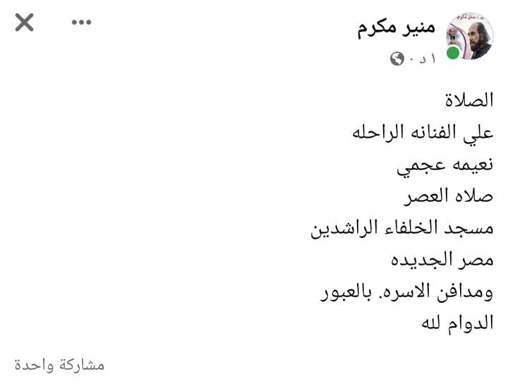 وكتب منير مكرم منشورًا، عبر حسابه الشخصي بموقع التواصل الاجتماعي فيسبوك، قال فيه: الصلاة على الفنانة الراحلة نعيمة جمي بعد العصر من مسجد الخلفاء الراشدين مصر الجديدة، ومدافن الأسرة بالعبور.. الدوام لله.