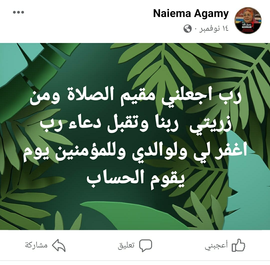 كانت قد كتبت نعيمة عجمي منشورًا، عبر حسابها الشخصي بموقع التواصل الاجتماعي فيس بوك، قالت فيه: رب اجعلني مُقيم الصلاة ومن ذريتي.. ربنا وتقبل دعائي، ربي اغفر لي ولوالدي وللمؤمنين يوم يقوم الحساب.