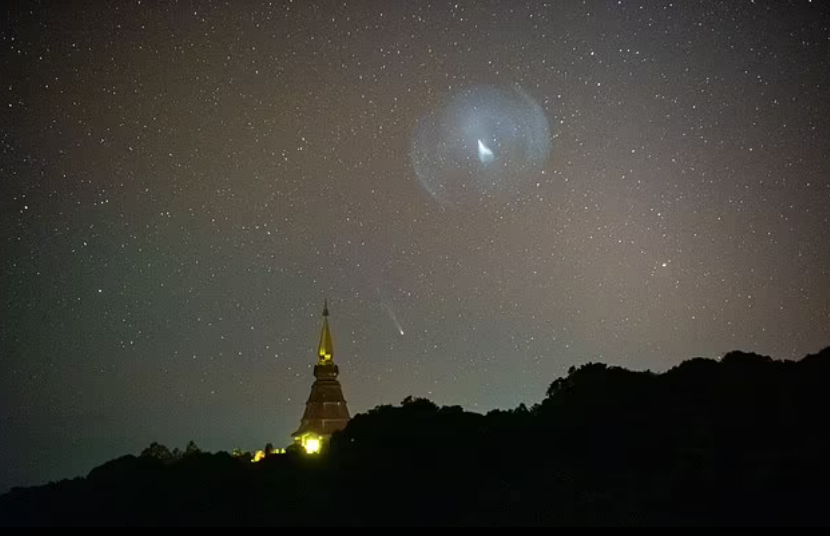 وشاركت وكالة ناسا صورة مذهلة للمذنب ليونارد وهو يرتفع خلف عمود من إطلاق تلسكوب جيمس ويب الفضائي التابع لناسا، والتقطت اللقطة المذهلة، والتي ظهرت كصورة فلكية لليوم لوكالة ناسا، من تايلاند وتظهر باغودا في حديقة دوي إنتانون الوطنية في المقدمة.