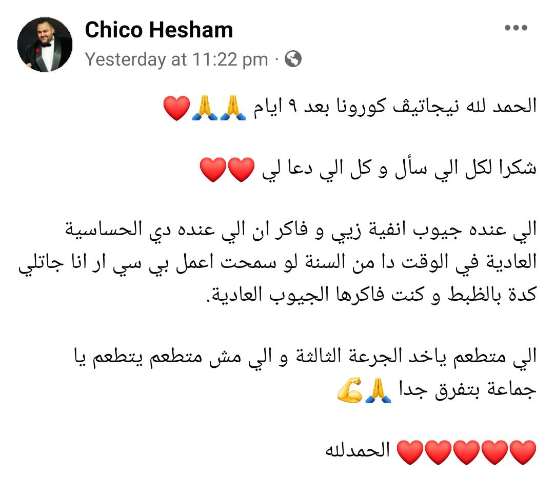 وكتب شيكو عبر حسابه الرسمي بموقع التواصل الاجتماعي فيسبوك: الحمدلله نيجاتيف كورونا بعد 9 أيام، شكرا لكل اللي سأل ودعا ليا، اللي عنده جيوب أنفية زيي وفاكر أن اللي عنده الحساسية العادية في الوقت دا من السنة لو سمحت أعمل بي سي أر، أنا جاتلي كدا بالظبط وكنت فاكرها الحساسية العادية، واللي متطعم ياخد الجرعة الثالثة واللي مش متطعم يتطعم يا جماعة بتفرق جدا.