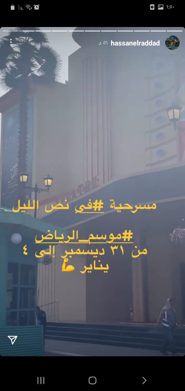 وشارك حسن الرداد جمهوره بفيديو جديد له في السعودية، وذلك قبل عرض مسرحيته في نص الليل، مشوقًا جمهوره لهذا العمل، وذلك عبر ستوري له بموقع تبادل الصور والفيديوهات القصيرة انستجرام، وعلق عليه قائلًا: مسرحية في نص الليل موسم الرياض من 31 ديسمبر إلى 4 يناير.