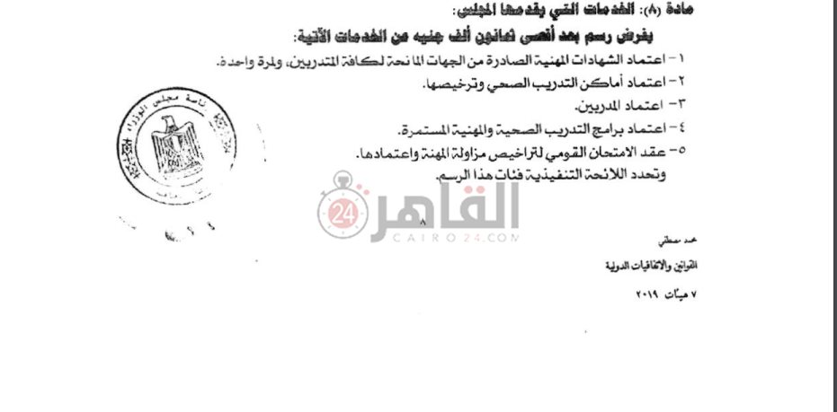 ونظمت المادة الثامنة من مشروع قانون المجلس الصحي المصري والذي انفرد به القاهرة 24، الخدمات التي يقدمها والتي منها اعتماد الشهادات المهنية الصادرة من الجهات المانحة لكافة المتدربين ولمرة واحدة، فضًلا عن اعتماد أماكن التدريب الصحي وترخيصها واعتماد المدربين.