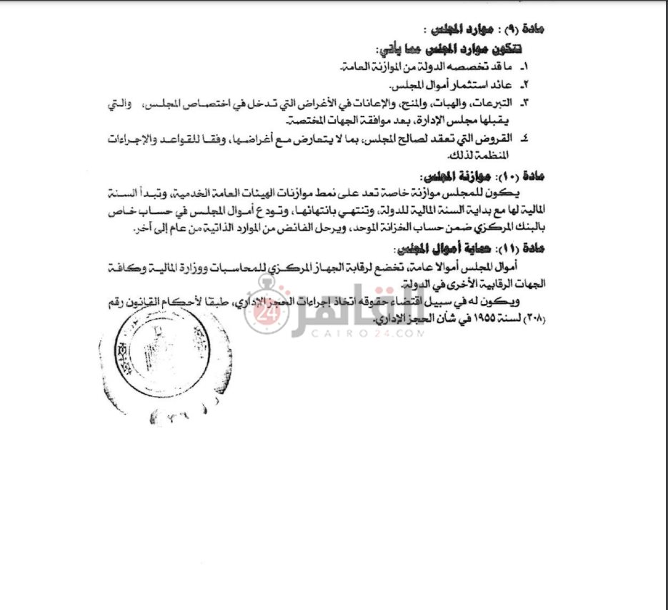 أما المادة 11 اهتمت بكيفية حماية أموال المجلس من خلال أن تخضع لرقابة الجهاز المركزي للمحاسبات، ووزارة المالية وكافة الجهات الرقابية الأخرى في الدولة.
