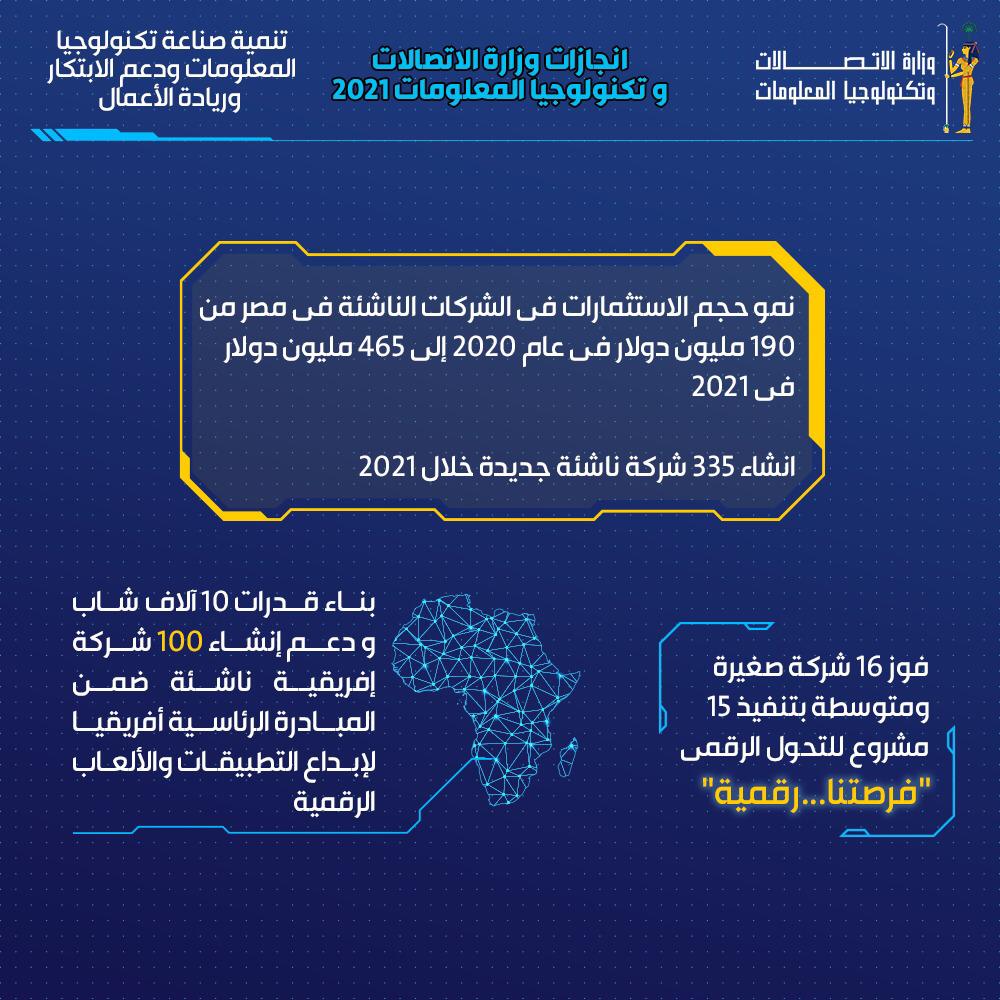 حققت وزارة الاتصالات وتكنولوجيا المعلومات خلال عام 2021، خطوات في تنفيذ استراتيجية مصر الرقمية، والتي تهدف من خلالها إلى تبني أحدث التكنولوجيا العالمية، ودعم الفكر الابتكاري لخلق مجتمع رقمي متكامل يتم من خلاله بناء الانسان المصري، وتطوير قطاعات الدولة، وتعزيز مكانة مصر على خريطة صناعة الاتصالات وتكنولوجيا المعلومات.