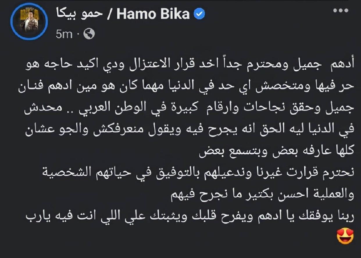 ونشر حمو بيكا صورة لأدهم نابلسي عبر حسابه الرسمي بموقع التواصل الاجتماعي فيسبوك، وعلق قائلا: أدهم جميل ومحترم جدًا أخد قرار الاعتزال ودي أكيد حاجه هو حر فيها، ومتخصش أي حد في الدنيا مهما كان هو مين، أدهم فنـان جميل وحقق نجاحات وأرقام كبيرة في الوطن العربي.