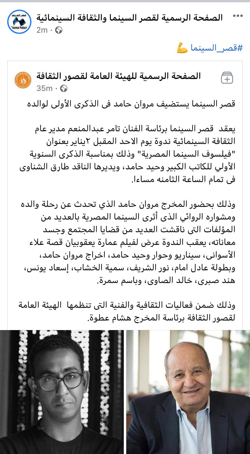يعقد قصر السينما برئاسة الفنان تامرعبدالمنعم مدير عام الثقافة السينمائية ندوة بعنوان فيلسوف السينما المصرية، وذلك بمناسبة الذكرى السنوية الأولي للكاتب الكبير وحيد حامد ويديرها الناقد طارق الشناوى، وذلك يوم الأحد المقبل في تمام الساعة الثامنة مساءً.