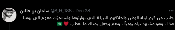 وغرد حساب باسم حسين الثقفي: مشكلة الناس ركزت على بعض السلبيات وتركت جانب من جوانب البذل والعطاء والكرم وهذه صفة صاحبها يرقى ويبقى ذكره عمرا ثاني، فهاهم الناس يحمدون لحاتم الطائي كرمه رغم أنه غير مسلم، فكيف لو جمع بين الإسلام وخصاله الحميدة، تحية طيبة لك من بذل وأكرم وبدأ بمن يعول من أهل وجيرانه والمسلمين.
